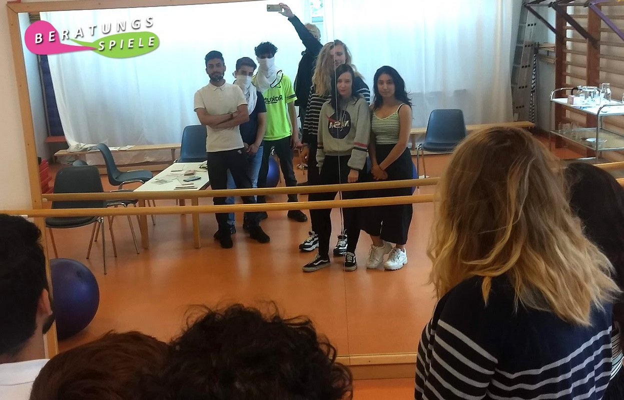 Als eigenes Modul finden Workshops mit geflüchteten und lokalen Jugendlichen im Hellersdorfer Stadtteilzentrum KOMPASS statt (s. Foto). In den sogenannten “BeratungsSpielen” bilden Kleingruppen fiktive Personen (Avatare), die sich in Rollenspielsituationen in unterschiedlichen Problemlagen befinden.