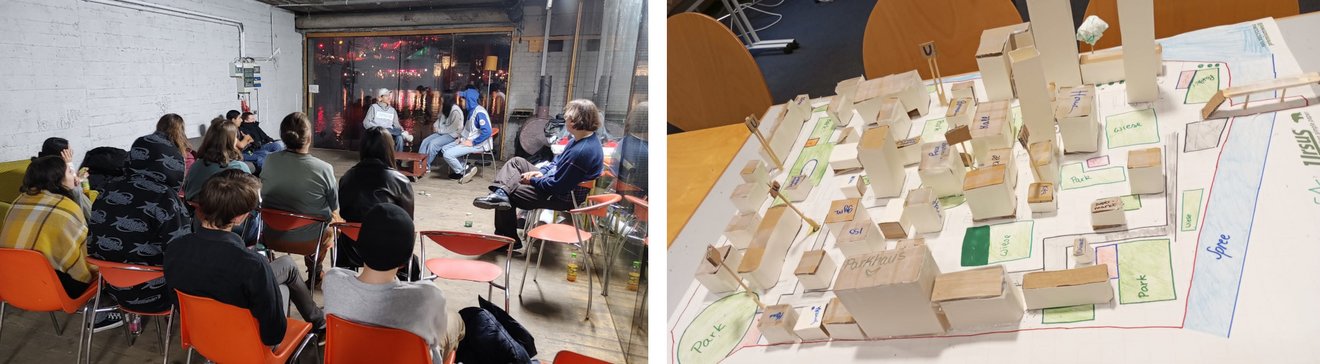 Vertreter:innen der bezirklichen Jugendförderung Friedrichshain-Kreuzberg (unser Fördergeber des Projekts) und des lokalen Mieterbeirats der landeseigenen WBM Wohnungsbaugesellschaft Berlin-Mitte mbH waren zu Gast und die Präsentation der Jugendlichen von den entstandenen Szenen und Plänen waren eine Anregung für ein lebendiges Gespräch (und gemeinsame Rollenspiel-Szenen), was im Kiez gut ist und was noch besser werden könnte.